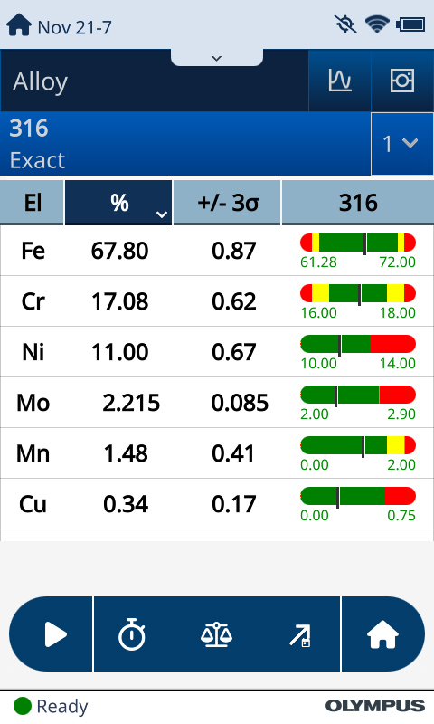 4. 結果:能譜經軟件處理后顯示為樣件的元素組成。在檢測金屬時,我們將測得的元素成分與某個特定的牌號相匹配。
