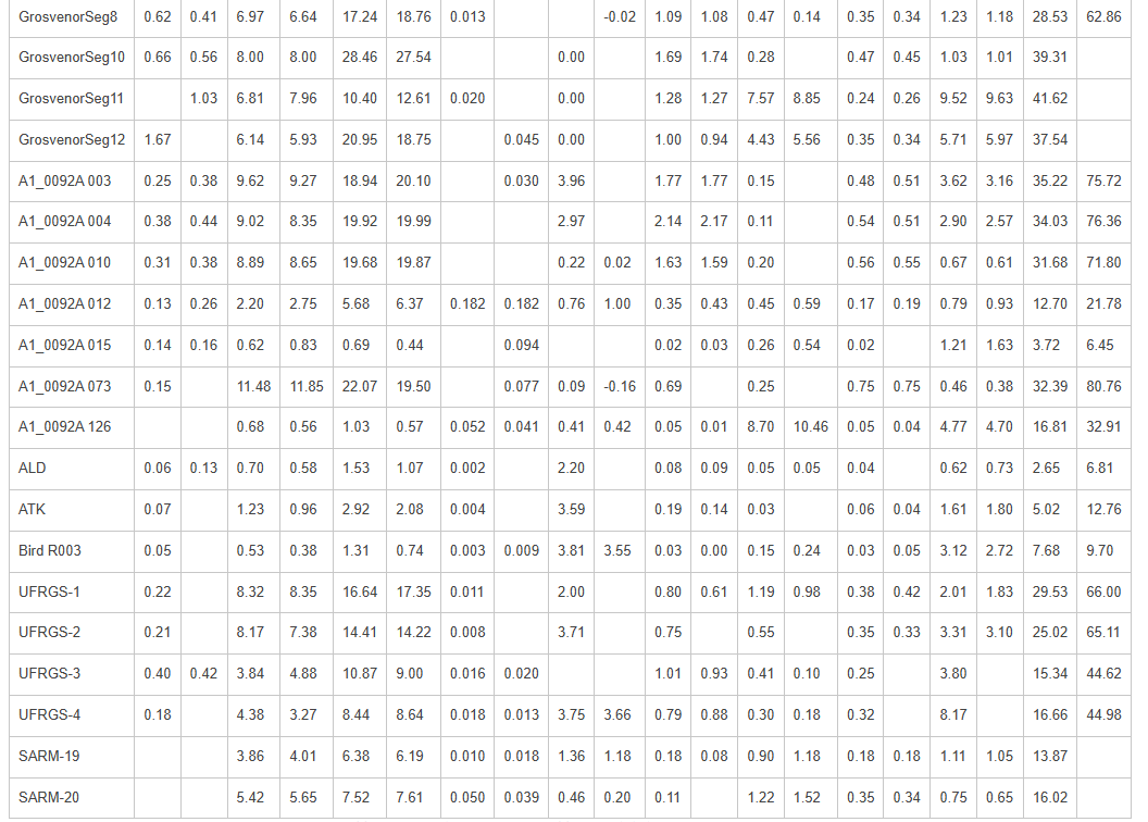 圖2. 奧林巴斯手持式XRF光譜儀檢測(cè)大量煤認(rèn)證參考材料(CRM)獲得的結(jié)果與這些材料的標(biāo)稱值高度吻合。上面的圖表表明對(duì)于重要元素:Mg、Al、Si、P、S、K、Ca、Ti和Fe,實(shí)驗(yàn)室認(rèn)證值和XRF分析儀獲得的數(shù)據(jù)值在準(zhǔn)確性和精確性方面都表現(xiàn)出高度的一致性。 數(shù)據(jù)表包含了繪制這些圖表所依據(jù)的實(shí)驗(yàn)室數(shù)據(jù)和XRF數(shù)據(jù)。數(shù)據(jù)承蒙新南威爾士大學(xué)生物和地球科學(xué)學(xué)院提供 - ACARP項(xiàng)目。