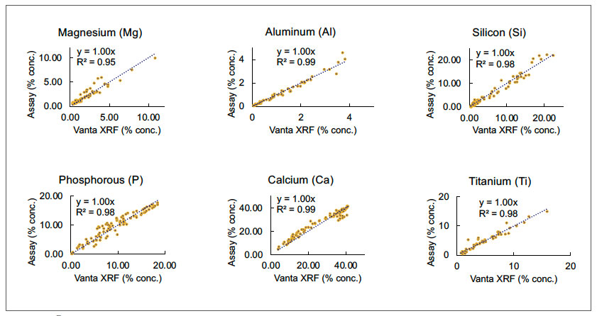圖1.Vanta手持式XRF光譜儀在檢測由客戶提供的各種磷礦石樣品時所獲得的元素含量值與測定值高度吻合,表現(xiàn)了出色的性能