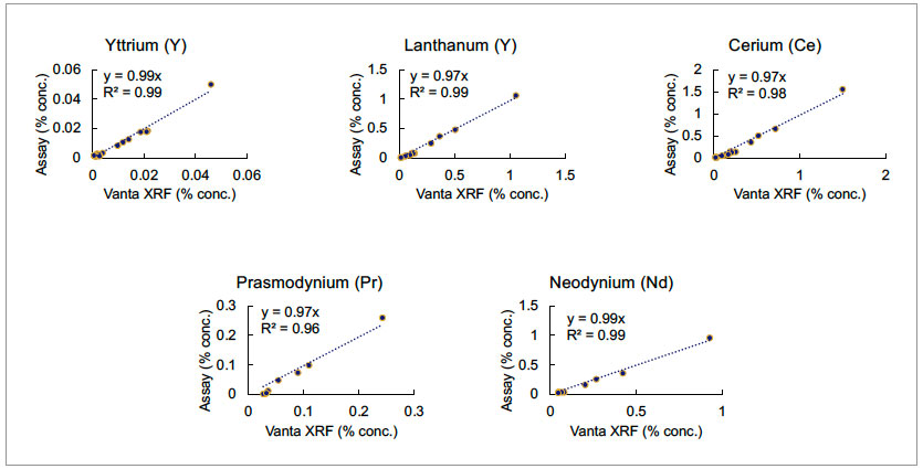 圖3. Vanta手持式XRF光譜儀在檢測由OREAS提供的標(biāo)準(zhǔn)樣品中的稀土元素時表現(xiàn)出很高的性能。