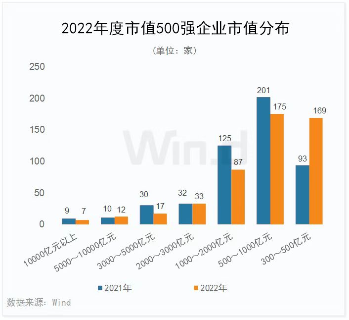 2022年度,500強中共有7家公司市值超1萬億元,數量較去年減少2家,3000-5000億元之間的企業、1000-2000億元之間的企業、500-1000億元之間的企業均有顯著減少,300-500億元之間的企業明顯增多。2022年度,500強企業平均市值為1325億元,中位數市值664億元,最低門檻為343億元,均出現回落。完整榜單中,共有76家新面孔躋身500強。