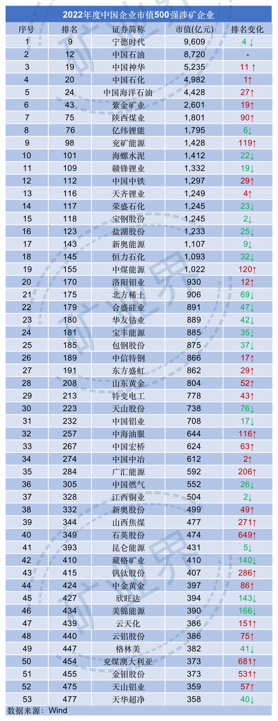 近日,Wind發布了2022年度“中國上市企業市值500強”榜單,礦業界梳理發現,共有53家涉礦企業入圍排行榜,其中寧德時代、中國石油、中國神華市值排名涉礦企業前三。