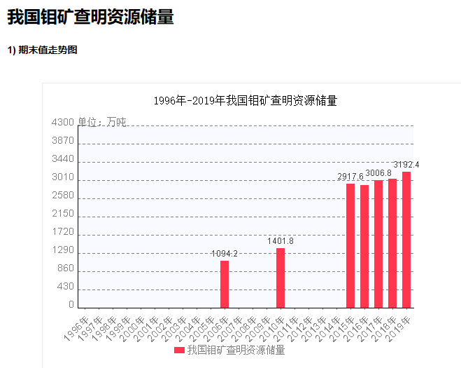 鉬在地殼中的平均含量約為0.00011%,已發現的鉬礦約有20種,其中最具工業價值的是輝鉬礦,其次為鎢相鈣礦、鐵鉑礦、彩鉬鉛礦、鉑銅礦等。根據美國地質調查局2015年發布數據,全球鉬資源儲量約為1100萬噸,探明儲量約為1940萬噸。