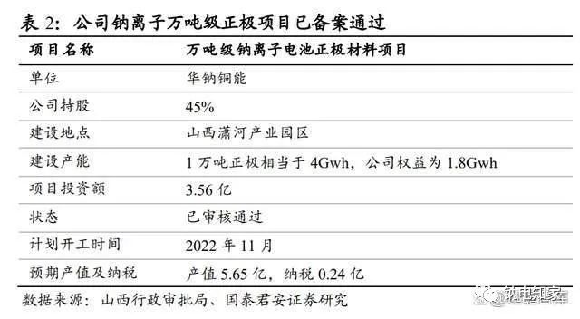 公司早在 2020 年就參與了中科海鈉的 Pre-A 輪融資,并于 21 年進一步增資。此后伴隨 21 年 6 月 1Mwh 鈉電儲能系統投運,公司即開啟了鈉離子正負極材料示范項目,該項目于 21 年 3 月投產。隨著年內電芯廠、PACK 廠的投產,預計將于年底開啟量產項目。