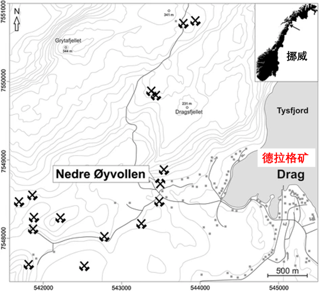 在斷裂帶北段也發(fā)現(xiàn)了克瓦維克(Kvalvik)熱液脈石英礦,推斷資源量70萬噸,其礦石質(zhì)量與內(nèi)索登礦類似,可用作高純石英原料。