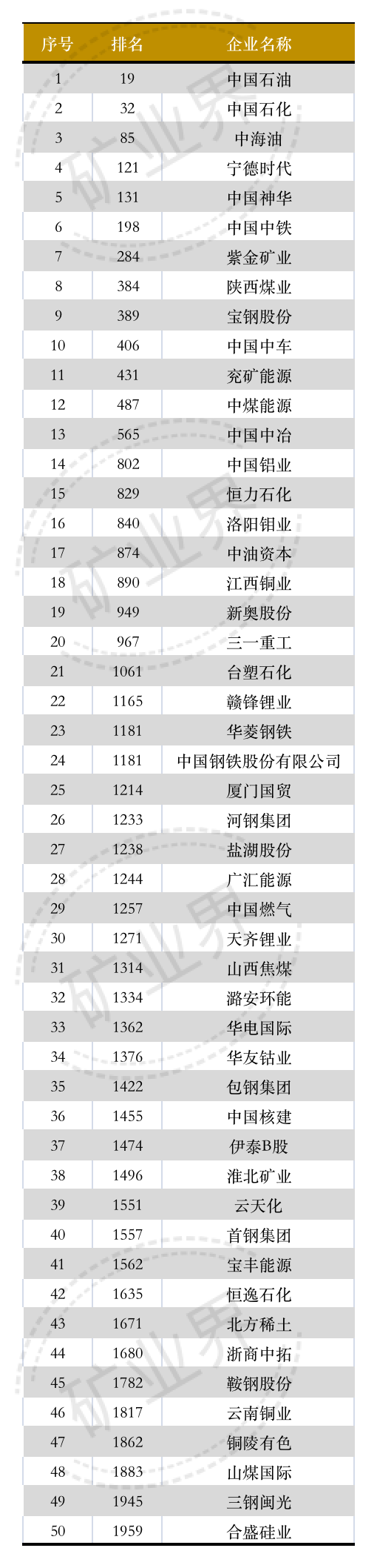 整理發(fā)現(xiàn),上榜的中國礦業(yè)相關(guān)企業(yè)共有50家,中國石油、中國石化和中海油這“三桶油”與上年相比,依然穩(wěn)坐中國礦業(yè)相關(guān)企業(yè)前三甲寶座。其中,中海油排名升幅最大,從去年第133位升至今年第85位 。