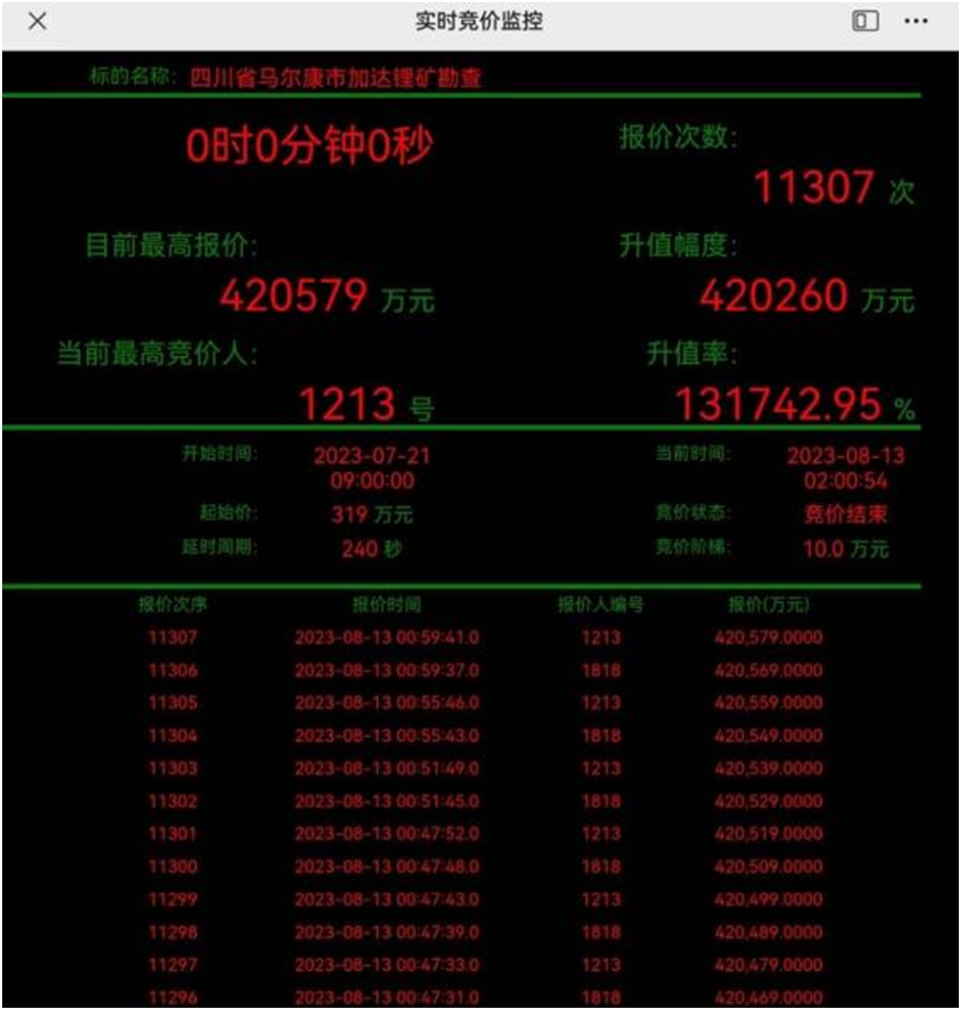 8月13日凌晨零點(diǎn)59分41秒,鏖戰(zhàn)三天三夜,四川省馬爾康市加達(dá)鋰礦勘探權(quán)拍賣塵埃落定,最終大中礦業(yè)力壓群雄拔得頭籌,由其全資子公司安徽省大中新能源投資有限責(zé)任公司(以下簡(jiǎn)稱大中新能源)以42.06億元競(jìng)得。