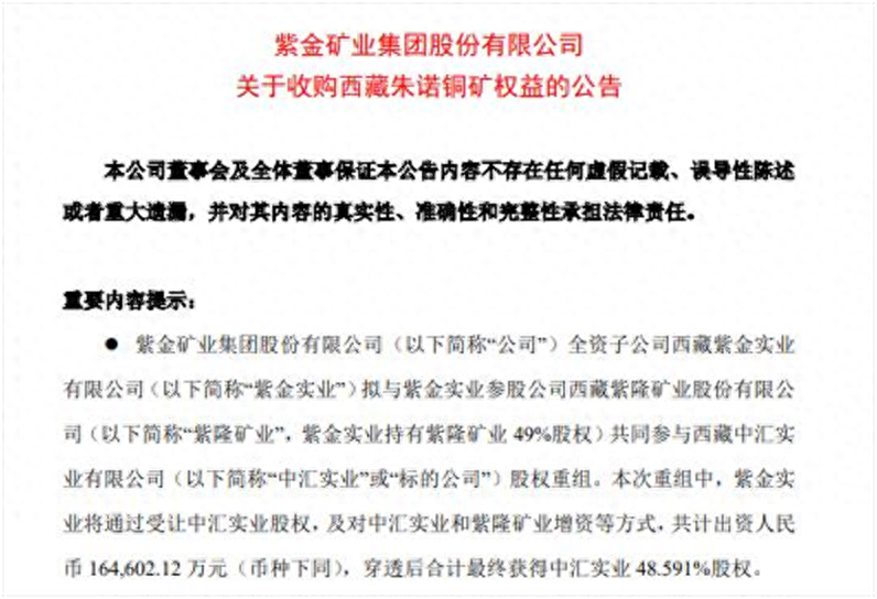 8月21日,紫金礦業(yè)宣布,以16.46億元收購中匯實(shí)業(yè)48.591%股權(quán),進(jìn)而獲得國內(nèi)未開發(fā)超大型銅礦西藏朱諾銅礦的相對控股權(quán)。根據(jù)協(xié)議,未來,朱諾銅礦的建設(shè)及運(yùn)營將由紫金礦業(yè)主導(dǎo)。