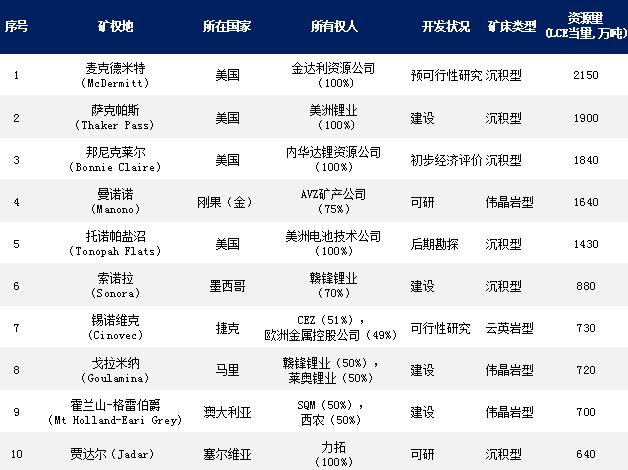 根據總資源量(LCE,碳酸鋰當量,萬噸,以下同),Mining Intelligence網站列出了世界前十大粘土和硬巖鋰礦。