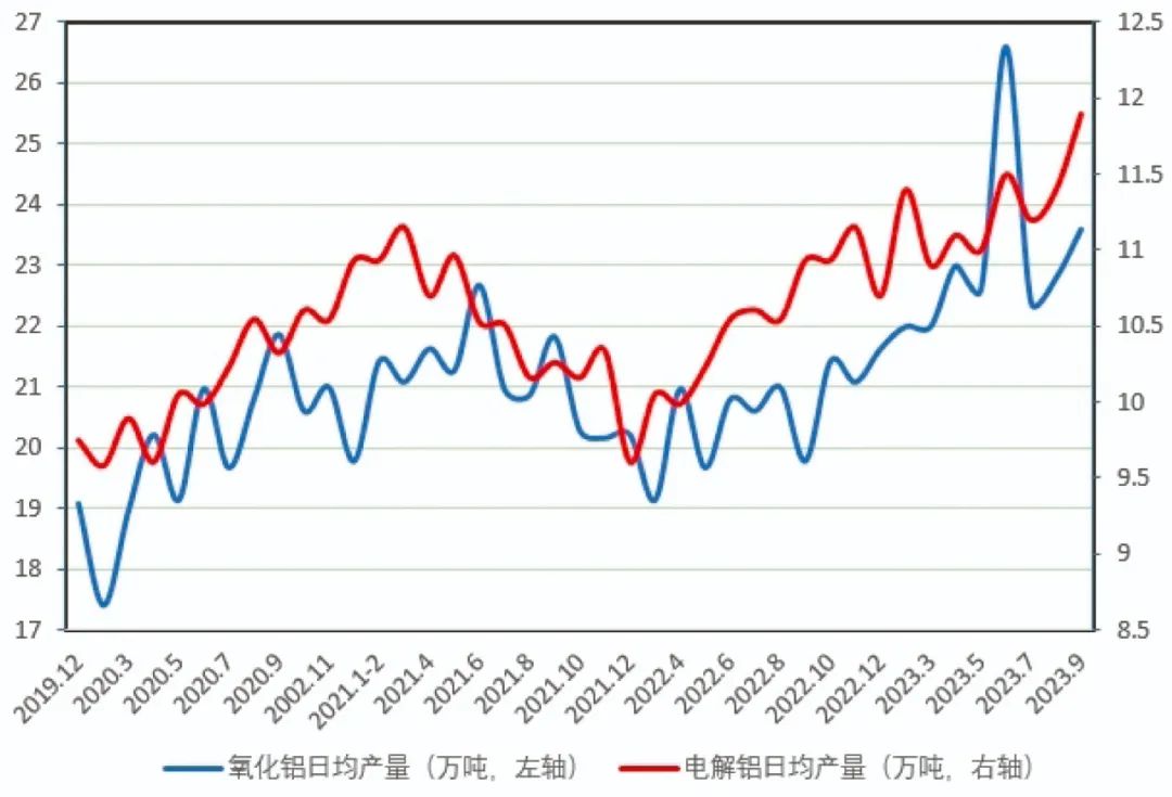 二是生產總體保持平穩。9月份,全國電解鋁和氧化鋁的產能產量總體保持平穩。部分地區電解鋁企業減產,主要集中在云南地區,云南地區枯水期將近,用電調節開始施行,部分電解鋁企業被要求提前采取電力負荷管控措施,實施降負荷運行,省內計劃第一輪壓減相關電解鋁企業約20%產能,預計減產規模約為115萬噸。9月份,全國電解鋁產量為357.7萬噸,同比上升5.3%,日均產量11.9萬噸,環比上升0.3萬噸 ,同比上升0.6萬噸;氧化鋁產量為707.2萬噸,同比上升1.6%,日均產量23.6萬噸,環比上升0.8萬噸,同比上升0.1萬噸。鋁冶煉產品月度日均產量見圖5。