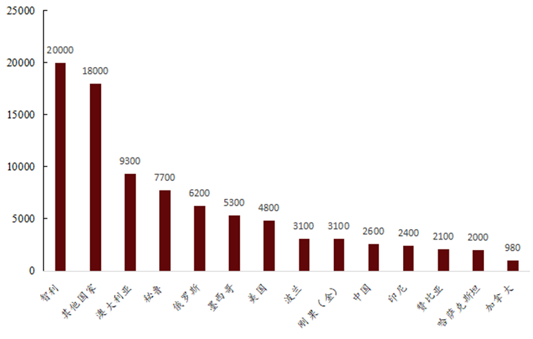 全球銅資源儲(chǔ)量分布較集中,據(jù)USGS數(shù)據(jù),2022年全球銅儲(chǔ)量8.9億噸,其中智利、澳大利亞、秘魯儲(chǔ)量規(guī)模居前,分別占比21%、11%、9%,CR3達(dá)到 41%。從供應(yīng)來(lái)看,智利、秘魯、剛果(金)為全球銅礦最重要的供給來(lái)源,2022年銅礦產(chǎn)量分別達(dá)520、220、220萬(wàn)噸,占全球銅礦供給分別 24%、10%、10%。值得注意的是,智利正面臨礦山老化、品位下降的問(wèn)題,年產(chǎn)量于2018年見(jiàn)頂于583 萬(wàn)噸,隨后逐年下滑;秘魯2019年產(chǎn)銅246萬(wàn)噸,隨后受疫情和當(dāng)?shù)卣值纫蛩財(cái)_動(dòng)有所減量,也在逐年下滑,2022年產(chǎn)量220萬(wàn)噸;而非洲代表國(guó)家剛果(金)銅供給增量顯著,逐漸成長(zhǎng)為最重要的供給國(guó)之一,年產(chǎn)量從2012年的60萬(wàn)噸增長(zhǎng)到2022年的220 萬(wàn)噸,與老牌產(chǎn)銅國(guó)秘魯相當(dāng)。