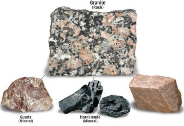 巖石的構成:如前所述,巖石由礦物或礦物質組成。巖石的組成取決于其中存在的礦物。有些巖石可能由單一礦物組成,而其他巖石可能含有多種礦物。例如,花崗巖主要由石英、長石和云母組成,而玄武巖主要由斜長石和輝石組成。礦物的構成:礦物是具有特定化學配方的元素化合物。它們是巖石的基本組成部分,并且可以根據它們獨特的物理和化學特性來識別。一些常見的礦物包括石英、長石、云母、方解石和赤鐵礦,每種都有其獨特的特征。