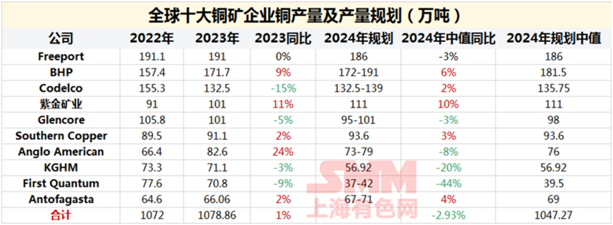 統(tǒng)計2023年全球十大龍頭礦企的產(chǎn)量數(shù)據(jù)顯示,智利國家銅業(yè)公司Codelco2023年產(chǎn)量降幅高達(dá)15%,第一量子First Quantum下降9%,嘉能可Glencore和波蘭KGHM產(chǎn)量分別下降5%和3%。據(jù)計算,十大龍頭礦企2023年總產(chǎn)量增幅僅為1%。