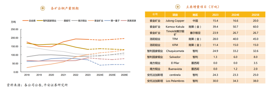 從全球市場來看,受前期資本開支不足以及在產(chǎn)礦品位下滑影響,多數(shù)銅礦企業(yè)在未來3年內(nèi)產(chǎn)量規(guī)模未現(xiàn)明顯增量,甚至部分企業(yè)出現(xiàn)負(fù)增長預(yù)期。2023年,全球十大銅礦生產(chǎn)商的“門檻”約為66萬噸銅產(chǎn)量,但考慮第一量子巴拿馬銅礦的停產(chǎn),波蘭KGHM產(chǎn)量下滑,洛陽鉬業(yè)躋身全球前十大產(chǎn)銅商之列,難度并不大。