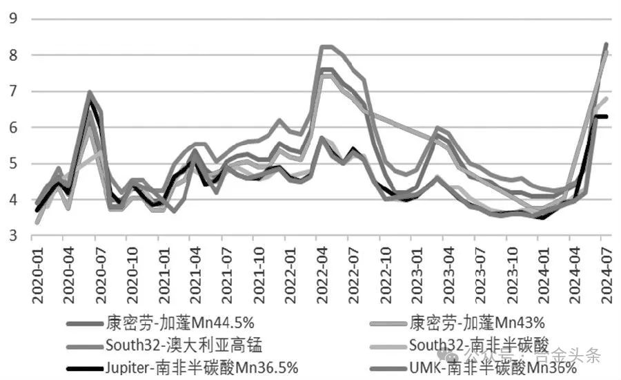 圖為錳礦外盤報(bào)價(jià)(單位:美元/噸度)
