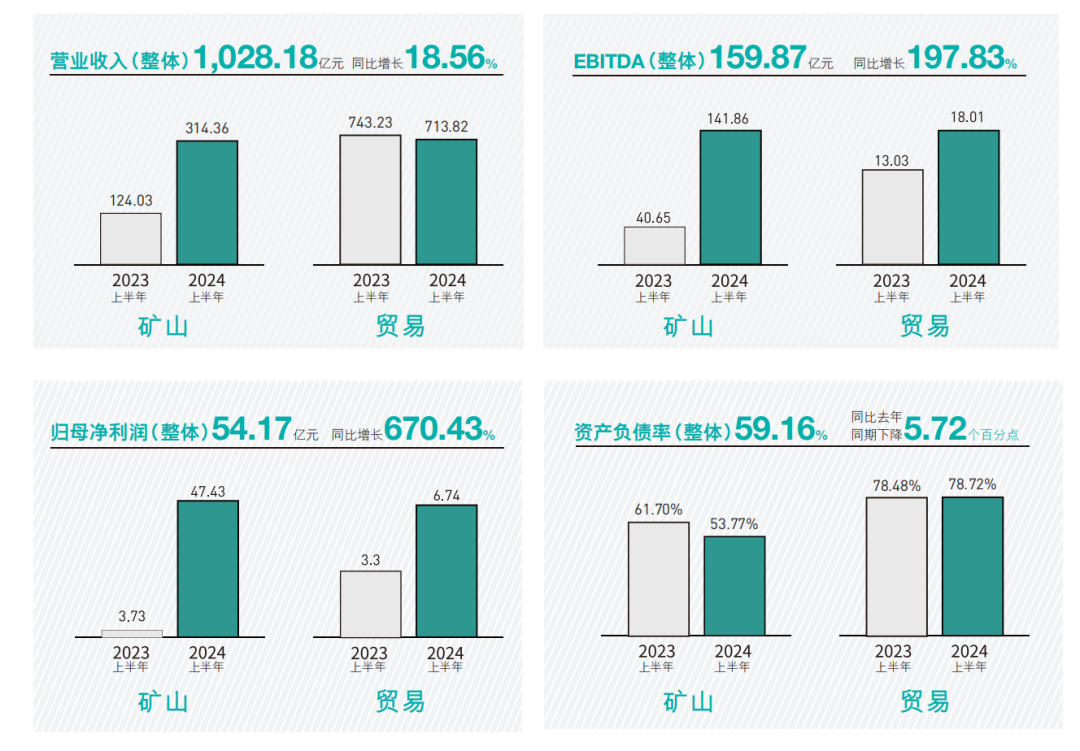 8月23日晚,洛陽鉬業發布的2024年中期報告顯示,上半年公司實現營業收入1028.18億元,同比增長18.56%,實現歸母凈利潤54.17億元,同比增長670.43%,均創下歷史新高;實現息稅折攤前利潤159.87億元,增長197.83%,資產負債率59.16%,同比下降5.72個百分點。同時,公司流動性充裕,上半年經營性凈現金流108億元,持有現金及現金等價物309億元。
