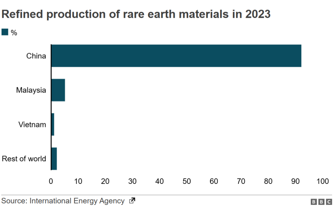 二是技術(shù)先進(jìn)。中國(guó)在稀土精煉和高端磁體制造方面掌握核心科技,控制著全球超過(guò)90%的稀土精煉產(chǎn)能,高性能釹鐵硼永磁體的生產(chǎn)也由中國(guó)主導(dǎo),全球產(chǎn)量超過(guò)90%。