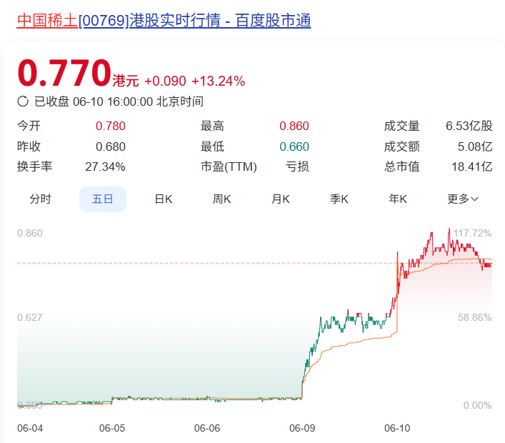 更猛的是港股的中國(guó)稀土,盤(pán)中一度暴漲超50%!